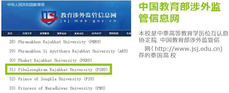 本校是中泰高等教育学历学位互认协定院校,是中国教育部涉外监管信息网推荐的泰国高校,国内教育部承认披博宋甘皇家大学的学历、学位和海外归国留学人员身份。