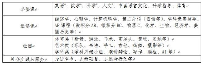 注:带*号的必修课程分层或分科目开展,同学在学校指导下根据学术基础、学术兴趣和升学目标选课。比如数学包括几何、代数2、直到AP微积分BC等,总共有6个层次可选;科学包括物理、化学、生物及相应的AP课程可选。