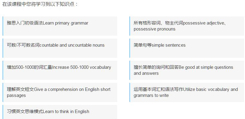 学习课程】:雅思入门阶段课程 【入学水平】:初一英语水平;能读懂简单句子,但无法阅读100字以上的短文;基础语法仍存在多处漏洞;缺乏听力中必备的语感;只能口头表达**简单的句子;词汇量在1000左右。 【学习课时】:80主课+20辅课+无期限网络课程(朗阁智学家科研教学系统) 【班级人数】:4人 【班级类型】:全日制小班授课;