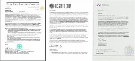 上图为加州大学圣克鲁兹分校和加州大学欧文分校双录取通知书