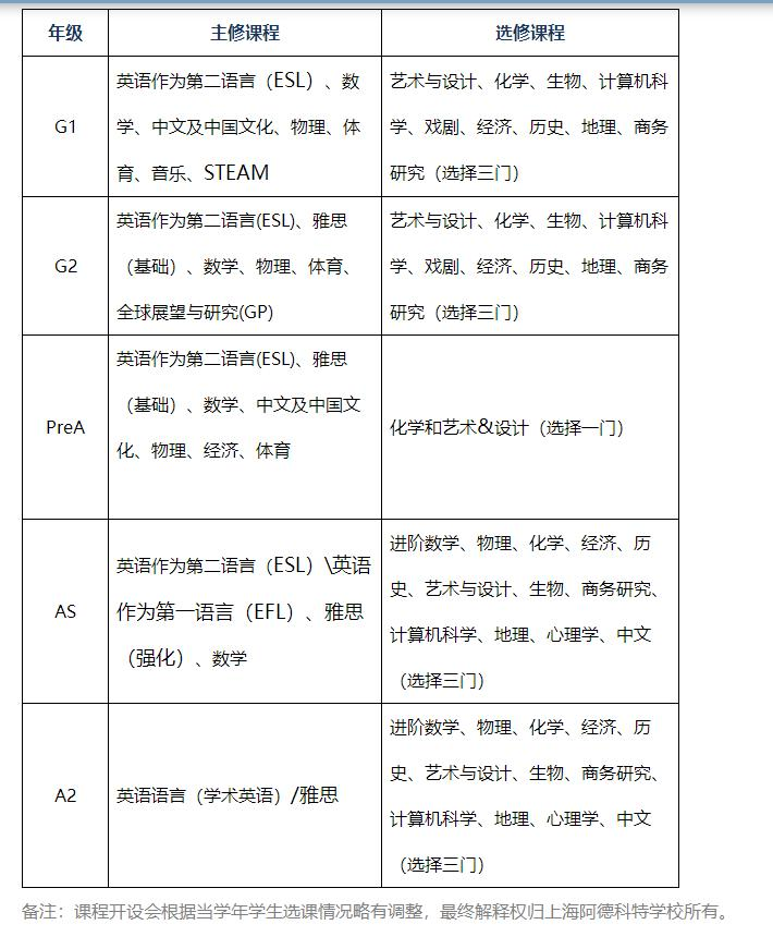 在AS年级,英语和数学是必修课程.学生可以从物理、化学、生物、经济、商务研究、历史、地理、心理学、计算机科学、艺术与设计选择三至四门课程。(详见AS年级选课表)