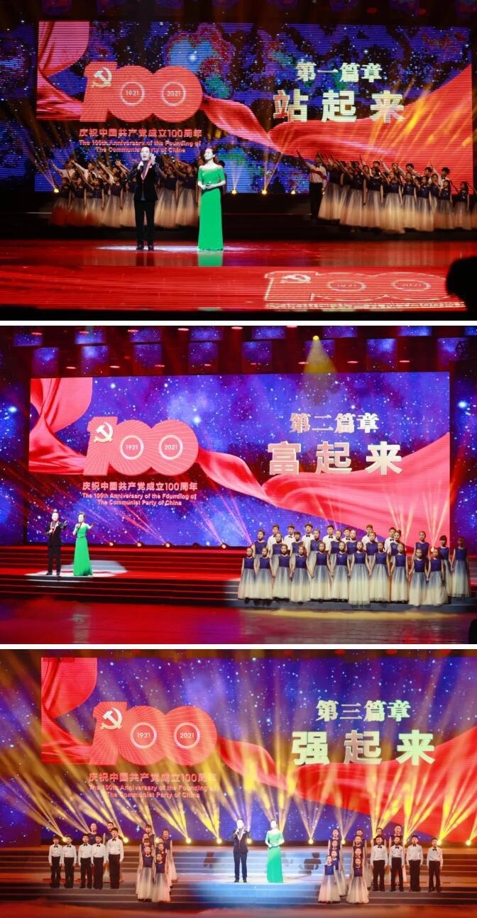 新华公学童声合唱团完美的用哼鸣式演唱法为晚会三个篇章开场,用歌声向中国共产党百年华诞献礼,用微笑和行动表明作为社会主义接班人的决心:“童心向党,坚决跟党走,听从党的指挥”。