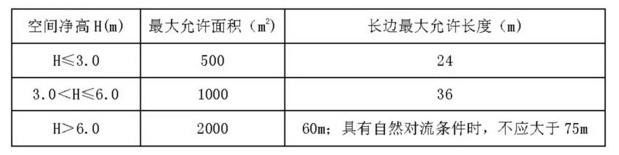 1、设置排烟系统的场所或部位应采用挡烟垂壁、结构梁及隔墙等划分防烟分区。防烟分区不应跨越防火分区。 2、挡烟垂壁等挡烟分隔设施的深度不应小于储烟仓厚度,当采用自然排烟方式时,储烟仓的厚度不应小于空间净高的20%,且不应小于500mm;当采用机械排烟方式时,不应小于空间净高的10%,且不应小于500mm。对于有吊顶的空间,当吊顶开孔不均匀或开孔率小于或等于25%时,吊顶内空间高度不得计入储烟仓厚度。 3、设置排烟设施的建筑内,敞开楼梯和自动扶梯穿越楼板的开口部应设置挡烟垂壁等设施。 4、公共建筑、工业建筑防烟分区的允许面积及其长边允许长度应符合下表的规定,当工业建筑采用自然排烟系统时,其防烟分区的长边长度尚不应大于建筑内空间净高的8倍。