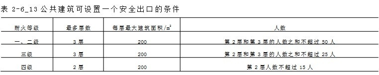 规范:《建筑设计防火规范》(GB50016-2014)5.5.8 公共建筑内每个防火分区或一个防火分区的每个楼层,其安全出口的数量应经计算确定,且不应少于2个。符合下列条件之一的公共建筑,可设置1个安全出口或1部疏散楼梯: 1 、除托儿所、幼儿园外,建筑面积不大于200m2且人数不超过50人的单层公共建筑或多层公共建筑的首层;