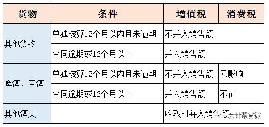 二、消费税 1、一般货物 收取押金时不缴纳消费税,逾期或收取1年以上,没收押金换算成不含增值税的销售额计算增值税和消费税; 2、啤酒、黄酒收取包装物押金不征消费税 由于啤酒黄酒采用从量定额办法征收消费税,应税消费品的计税依据是销售数量而非销售金额,征税的多少与销售数量成正比,而与销售金额无直接关系。 因此,企业销售啤酒时,如果发生包装物销售行为,或收取押金,而押金是以价格算的,不是以数量算的,所以不存在计征消费税的问题。 注意:啤酒包装物押金在收取时应并入销售额确定消费税适用定额税率的标准。 在没收押金时换算成不含增值税的税基缴纳增值税。 3、酒类(不含啤酒、黄酒) 包装物押金,无论包装物押金是否返还以及会计上怎么处理,都应该计入到酒类产品销售额中征收消费税。 三、企业所得税 1、预期包装物押金需要确定为收入; 2、从收取之日起计算,已超过1年(指12个月)仍未返还的原则上要确认为期满之日所属年度的收入。 图示如下: