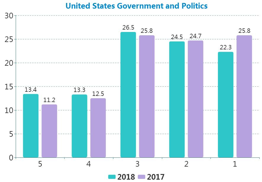 美国政治的情况比往年更为乐观,今年超过13%的5分率创造了历史新高,要知道就在几年前这门学科的5分率还是可怜的个位数。并且这种难度的学科获得卷面满分的考生竟然有112位!