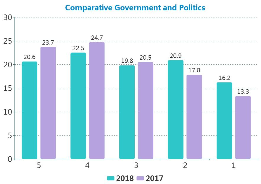 比较政治学在去年达到历史最高成绩,今年分数略有回落,保持在比较平稳的区间,成绩主要集中在4分。