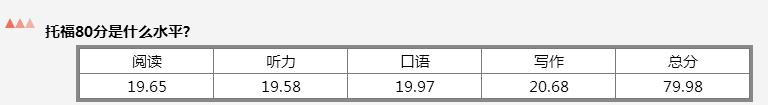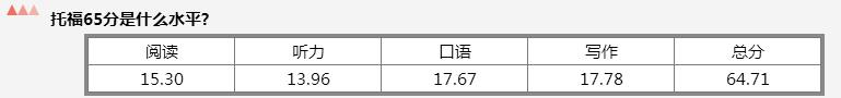 具体分析: 假如说经过一段时间的学习到了60多分,阅读是15.3分,听力是13.96分,口语是17.67,写作是17.78分。会发现前两科慢慢地赶上了,还没有追得上口语和写作,也在进步但是进步的相对平缓一些,总成绩大概进步了15分的样子。 阅读和听力部分,主要是词汇量需要向四级跨越。从50到65分主要解决的是从高中词汇到部分四级词汇。 听力部分,听力现在开始慢慢接触笔记,听力在听的时候好多也都能听懂,但是做题的时候想不起来原来文章里面怎么说的,这时候其实是要开始去记一些东西了。 当口语和写作到了十七八分的时候对你的内容和思路就开始逐渐要关注,原来在考个十四五分的时候内容到底合不合理深不深入没有太大关系,从十八九分开始往上题思路就很重要,还有思路表达题语法问题就变得尤为关键。