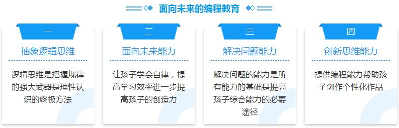 人工智能时代,孩子该学什么? 马云曾说过:“在数据时代,机器一定比人聪明,机器比人算得更快、记得更牢。人很难与机器去比知识,尤其AI出来以后。”未来社会是知识社会,也是智慧竞争,告别传统应试教育,孩子需要创新教育理念,培养创新型人才,提升学习能力、想象力、创造力及团队协作能力,增强核心竞争力。 国外众多学院开设编程课程,吸纳编程人才,呼吁学生走进编程、了解编程知识。奥巴马、比尔盖茨、扎克伯格等都为编程代言,且深切明白编程对于未来科技发展的重要性。而孩子学习少儿编程的目的即编程思维,培养孩子独立思考、分析、解决问题的能力,成为未来科技创造者,为社会发展做出贡献。
