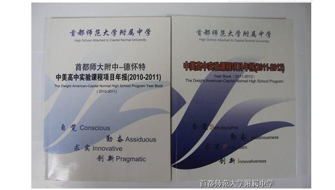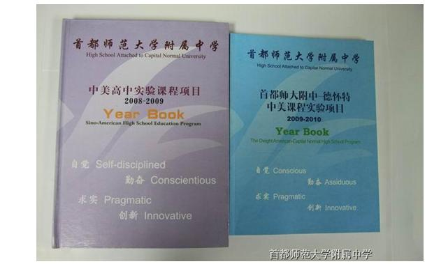 附:首师大附中中美高中实验课程项目2008—2012年年册(Year Book)共计四本(截至到2012年7月)。每一本年册以图文并茂的形式记载了本项目学生在该年的成长足迹,包括到校注册、课堂学习、校园生活、项目内重大活动等各个方面。项目毕业生在毕业之际均可获得三本厚重而凝聚美好回忆的项目年册。这里不仅记录了项目内每一位学生的青春笑脸,也为大家留下了教职员工们的守望身影,更是项目送给的毕业生的珍贵礼物。